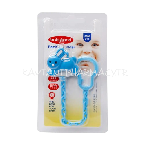 زنجیر پستانک بی بی لند طرح خرگوشی بلیستر آبی کد ۵۱۶، محصولی کاربردی و ایمن برای نگهداری پستانک کودک است.