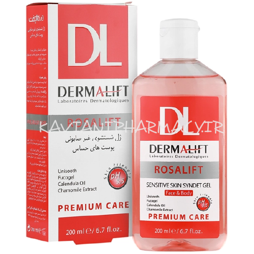 ژل شستشوی غیر صابونی رزالیفت درمالیفت مخصوص پوست‌های حساس، کاهش‌دهنده قرمزی و التهاب، فاقد پارابن و مواد صابونی، مناسب برای اگزما و رزاسه.